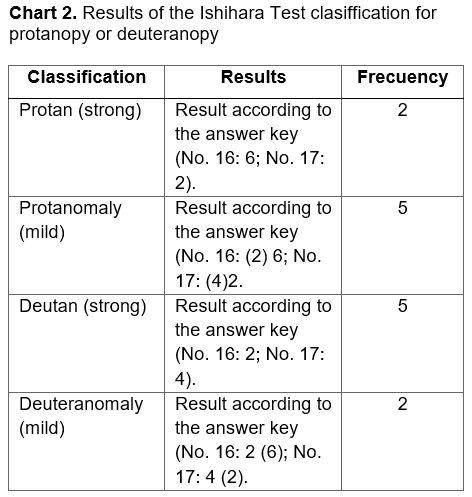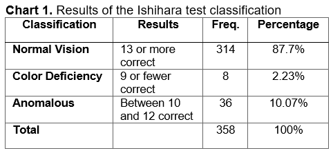 Chart 1 contains the results of the Ishihara test showing 8 people with color deficiency for which they are considered dichromatic; 87% (312) classify as normal and 10% (36) classify as anomalous.