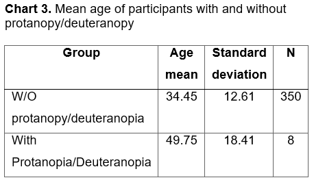 A variance analysis was conducted (ANOVA) to compare age between groups with and without protanopy/deuteranopy. Chart 3.
