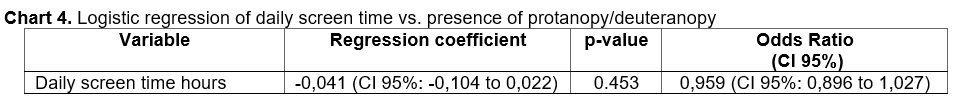 Chart 4 presents the analysis of the relationship between daily screen time and the occurrence of protanopy/deuteranopy using logistic regression.