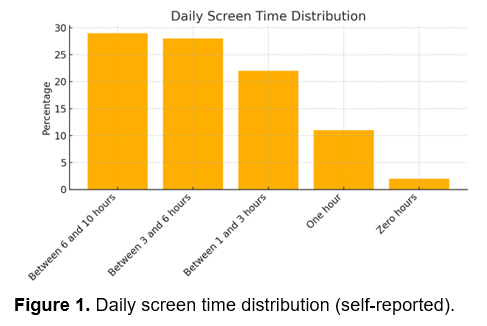 Participants’ daily screen time was grouped in intervals with a mean of 5.33 ± 3.56 hours per day. The majority spent 6 to 10 hours per day viewing screens (Figure 1).