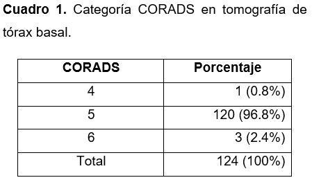 La tomografía de tórax inicial reportó el sistema de clasificación CORADS, en la cual la categoría 5 fue la que se reportó en el mayor número de pacientes con un 96.8% (n:120), categoría 6 en el 2.4% (n:3) y 4 1% (0.8%). (Cuadro 1).