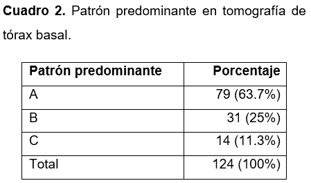 Se demostró que no existe una correlación significativa entre el patrón predominante y el puntaje de la tomografía de tórax inicial respecto a cambios fibrocicatriciales; en el control al 1 mes se identifica que persistía el patrón predominante del estudio inicial y en el control tomográfico a los 6 meses la mayoría de los pacientes tenía una tomografía dentro de los parámetros normales.