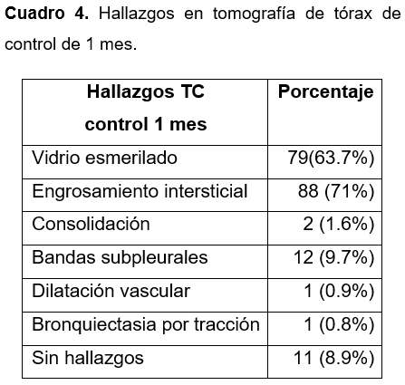 Se registraron los hallazgos en la tomografía de tórax de control al mes identificando el engrosamiento intersticial como el hallazgo con mayor frecuencia en un 71% (n:88) y vidrio esmerilado en 63.7% (n:79), bandas subpleurales en el 9.7% (n:12); así mismo se reportaron pacientes sin hallazgos en un 8.9% (n:11). En menor frecuencia consolidación con 1.6% (n:2), dilatación vascular 0.9% (n:1) y bronquiectasia por tracción 0.8% (n:1). (Cuadro 4).