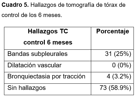 En el control tomográfico a los 6 meses se registró que el 58.9% de los pacientes (n:73) no presentaron hallazgos, el 25% reportó bandas subpleurales (n:31), bronquiectasias por tracción en el 3.2% (n:4) y ningún paciente con dilatación vascular. (Cuadro 5).