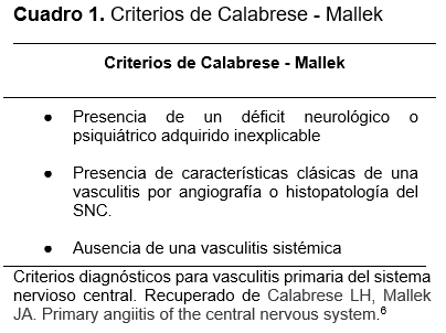 Ahora se considera a la VPSNC un espectro con distintos subtipos clínicos e histológicos5, para el diagnóstico de la enfermedad se deben cumplir los criterios propuestos por Calabrese y Mallek en 19886 [Cuadro 1], si bien la resonancia magnética no cuenta como un criterio diagnóstico, el uso de la secuencia Black-Blood contrastada es una gran herramienta para llegar al diagnóstico de VPSNC evidenciando el realce en las paredes de los vasos afectados y dividiéndolos en grados para mejorar el diagnóstico.7