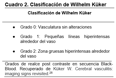 Dichas estenosis vasculares se caracterizan por presentar realce periférico el cual se evidencia mejor al paso de medio de contraste, por ello se deben tomar imágenes pre y post contraste en secuencia Black-Blood, el realce vascular se clasifica en tres grados según la clasificación propuesta por Kuker W, et al.25 la cual se resume en el cuadro 2 y se ejemplifica en la figura 5. El realce post contraste no es exclusivo de las vasculitis y puede ocurrir por otras causas entre las que se encuentran el lupus, angiopatía amiloidea, estenosis por aterosclerosis, disección vascular, Moya-Moya, arteritis de células gigantes, angiopatía postparto, vasoespasmo cerebral secundario a drogas y angeítis migrañosa entre otros. Por lo que este debe considerarse un estudio complementario con un amplio potencial para una visión directa de la vasculatura intracraneal y orientar al diagnóstico.26 Para este estudio se requiere un resonador de 3 Teslas el cual tiene una disponibilidad limitada en el medio impidiendo la realización de dicha secuencia en la paciente, la angiografía y biopsia de cerebro no eran opciones viables tampoco por lo que se dificulta más el diagnostico de las VPSNC.