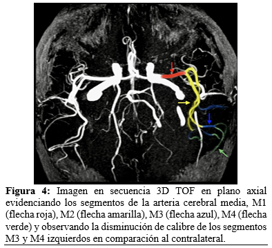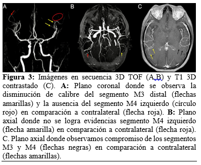 Al no presentarse eventos adversos en 24 horas de su evolución y sin contraindicación aparente, se decide iniciar tratamiento de forma empírica para encefalitis autoinmune, con base en corticosteroides [30 mg/kg Metilprednisolona por 3 días, posteriormente, 1 mg/kg de Prednisona al día], Ácido Micofenólico 1gr cada 12 horas, Hidroxicloroquina 200 mg cada 24 horas, así como, Ceftriaxona 1gr cada 12 horas como profilaxis antimicrobiana por estado de inmunosupresión. En la resonancia magnética de cráneo realizada el día 3 de marzo del 2025 donde se evidenció a nivel de lóbulo temporal izquierdo zonas engrosamiento de la corteza cerebral, así como zonas de focales de edema cerebral, realce focal cortical al paso de medio de contraste y zonas de restricción a la difusión magnética. [Figura 1]. Se delimitó un compromiso de los giros superior, medio e inferior del lóbulo temporal izquierdo [Figura 2]. En la evaluación vascular en la secuencia 3D TOF se identificó un compromiso de la vasculatura izquierda con estenosis de los segmentos M3 y M4 [Figura 3], la cual se esquematiza adecuadamente en el 3D TOF axial [Figura 4].