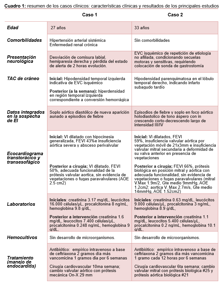 Las complicaciones cerebrovasculares clínicas o subclínicas, representa un escenario clínico grave y frecuente en la endocarditis infecciosa, que ensombrece dramáticamente el pronóstico, incrementando su mortalidad y morbilidad en especial al condicionar secuelas neurológicas graves como lo presentado en el caso 2; aspectos que fundamentan la importancia de su reconocimiento precoz y consiguiente inicio de tratamiento.