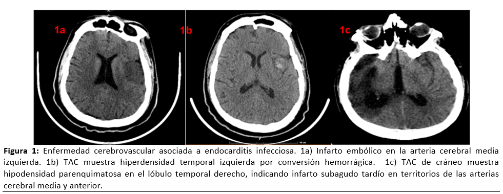 La endocarditis infecciosa (EI) en el contexto de enfermedad cerebrovascular isquémica (EVC) aguda plantea un desafío clínico frecuente de alta mortalidad y morbilidad, llegando a estar presente hasta en una cuarta parte de los pacientes con EI e incrementando su mortalidad hasta 3.2 veces.1,2