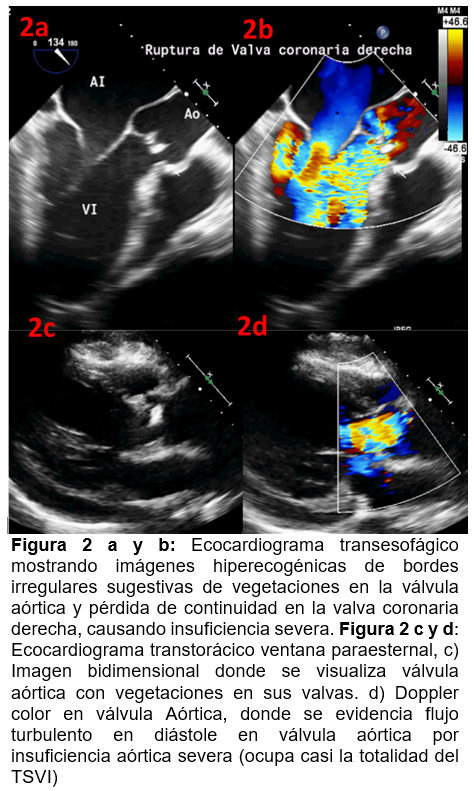 Caso clínico 2: Hombre de 33 años, con tabaquismo activo durante los últimos 15 años, sin antecedentes cardiovasculares. Ingresa por dos EVC isquémicos de etiología de etiología no determinada, evento inicial 6 meses y actual 2 semanas previa, que clínicamente generaron secuelas motoras y sensitivas, requiriendo gastrostomía. Ver figura 1 Durante la hospitalización, curso con episodios de fiebre nocturna >38 grados centígrados sin evidencia de foco infeccioso evidente, ante presencia de un soplo aórtico holodiastólico de tono áspero (III/IV), se realizó hemocultivos resultando negativos a desarrollo de microrganismo. Debido a la sospecha de endocarditis infecciosa, se inició antibioterapia empírica intravenosa a base de ceftriaxona más vancomicina. Un ecocardiograma revelo insuficiencia aórtica por vegetación móvil (21x3 mm) e insuficiencia mitral secundaria a deformidad de la valva anterior en presencia de vegetaciones. Ver figura 2 c y d Posterior firma de consentimiento debidamente informado se sometió a cirugía cardiovascular de cambio valvular aórtico y mitral con prótesis biológicas, debido a su adecuado posquirúrgico en la unidad de cuidados coronario y posterior terapia intermedia cardiovascular, se egreso para su seguimiento ambulatorio vía consulta.