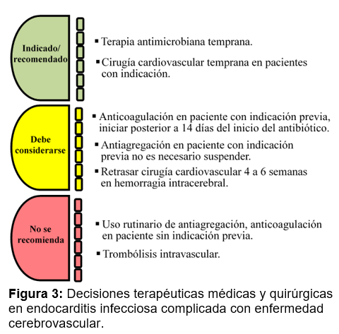 El diagnóstico se confirma mediante estudios de imagen, y las decisiones terapéuticas deben ser individualizadas, reconociendo como pilar terapéutico la terapia temprana con antibióticos; careciendo actualmente de evidencia sólida la antiagregación plaquetaria, anticoagulación y trombólisis. En paciente con indicación de cirugía cardíaca se puede realizar tempranamente y de forma segura, sugiriéndose ser más conservador en casos hemorrágicos.2,5,6